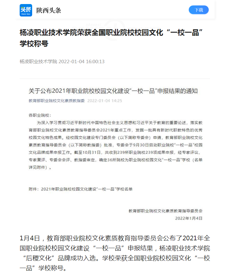1月4日,教育部职业院校文化素质教育指导委员会公布了2021年全国职业院校校园文化建设“一校一品”申报结果,杨凌职业技术学院“后稷文化”品牌成功入选。学校荣获全国职业院校校园文化“一校一品”学校称号。