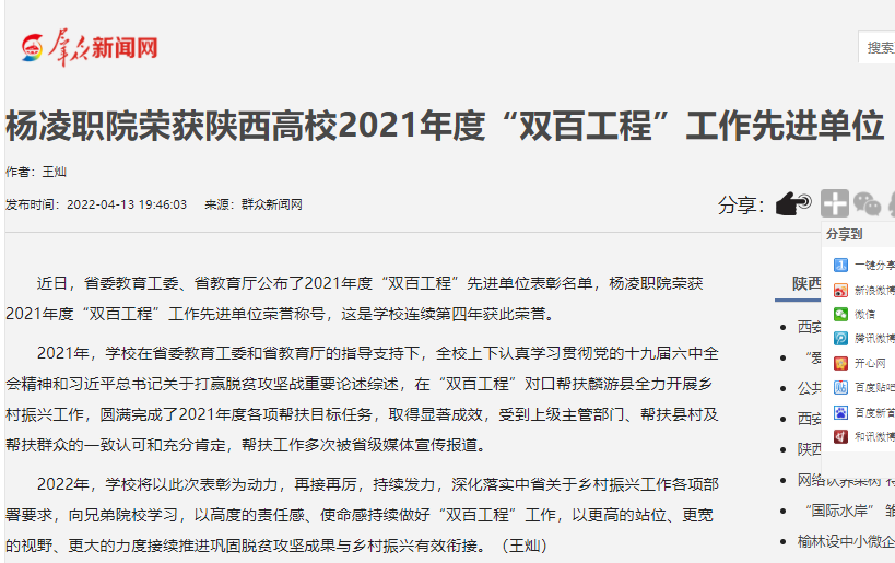 近日,省委教育工委、省教育厅公布了2021年度“双百工程”先进单位表彰名单,杨凌职院荣获2021年度“双百工程”工作先进单位荣誉称号,这是学校连续第四年获此荣誉。