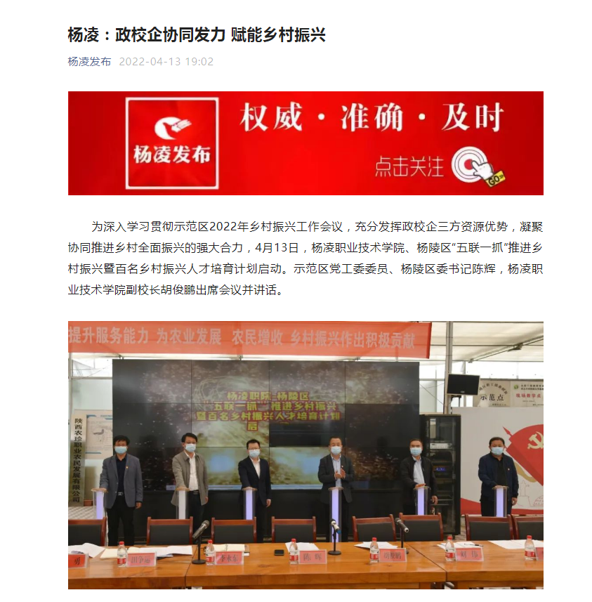 为深入学习贯彻示范区2022年乡村振兴工作会议,充分发挥政校企三方资源优势,凝聚协同推进乡村全面振兴的强大合力,4月13日,杨凌职业技术学院、杨陵区“五联一抓”推进乡村振兴暨百名乡村振兴人才培育计划启动。示范区党工委委员、杨陵区委书记陈辉,杨凌职业技术学院副校长胡俊鹏出席会议并讲话。