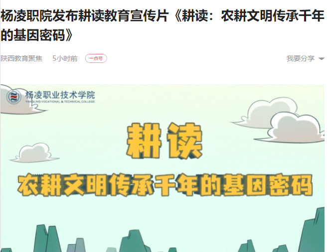 为贯彻落实教育部关于加强和改进涉农高校耕读教育工作方案,大力培养知农爱农新型人才,杨凌职院经过策划、制作,重磅发布动画宣传片《耕读:农耕文明传承千年的基因密码》,弘扬后稷文化,构建“力耕勤读”的全方位耕读教育体系,为乡村振兴赋能助力。