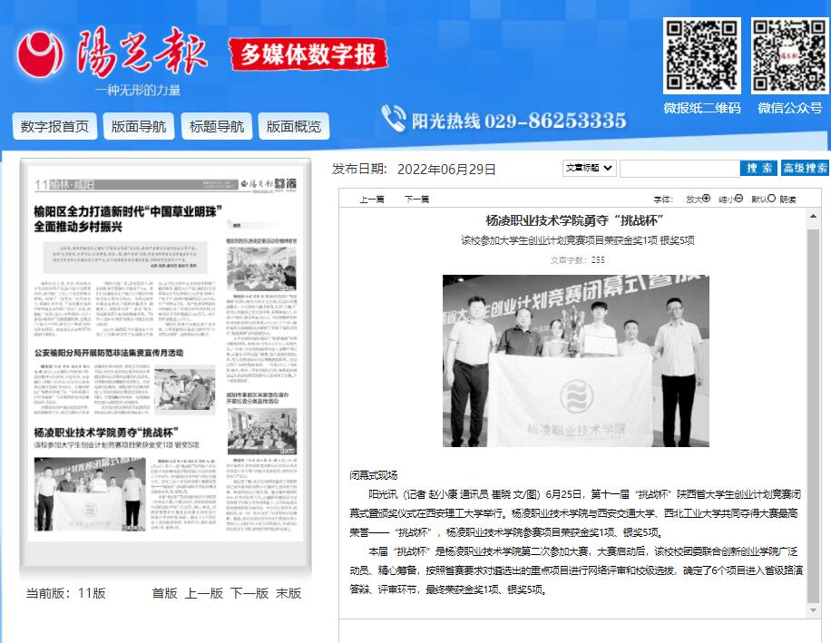 【阳光报】杨凌职业技术学院勇夺“挑战杯”