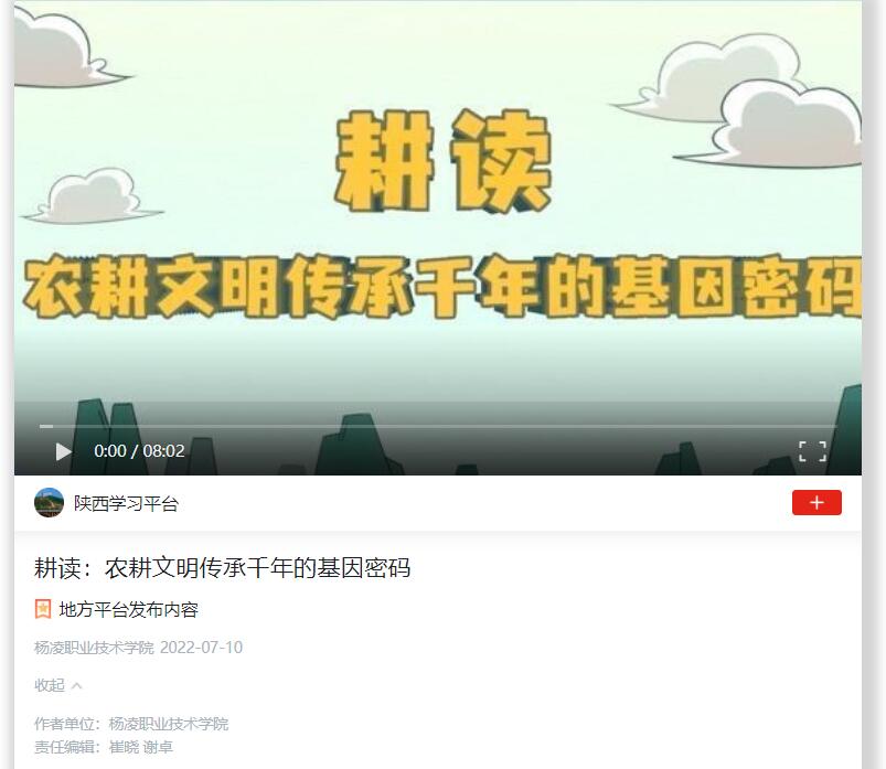 杨凌职业技术学院策划制作的动画科普宣传片《耕读:农耕文明传承千年的基因密码》主要讲述了我国农业发展的基本脉络,耕读文化的历史积淀、人文精神和当代意义,旨在弘扬后稷文化,构建“力耕勤读”的全方位耕读教育体系,教育引导学生在读中行、在行中悟,成为一个知行合一、品格高尚、报效祖国的有用之才,为乡村振兴赋能助力。