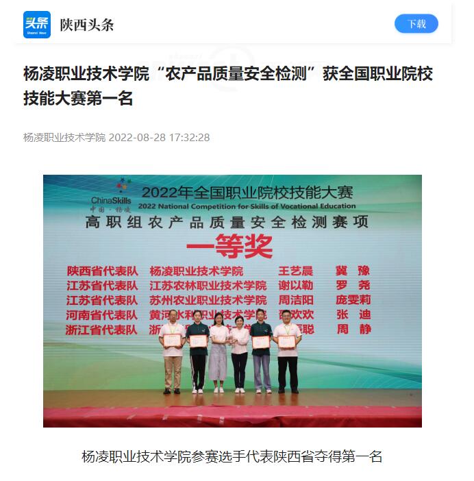 8月22日至27日,2022全国职业院校技能大赛“农产品质量安全检测”赛项在杨凌职业技术学院举行。经过激烈角逐,由杨凌职业技术学院王艺晨、冀豫2名学生组成的陕西省代表队,在本次赛项中取得了一等奖第一名的成绩。
