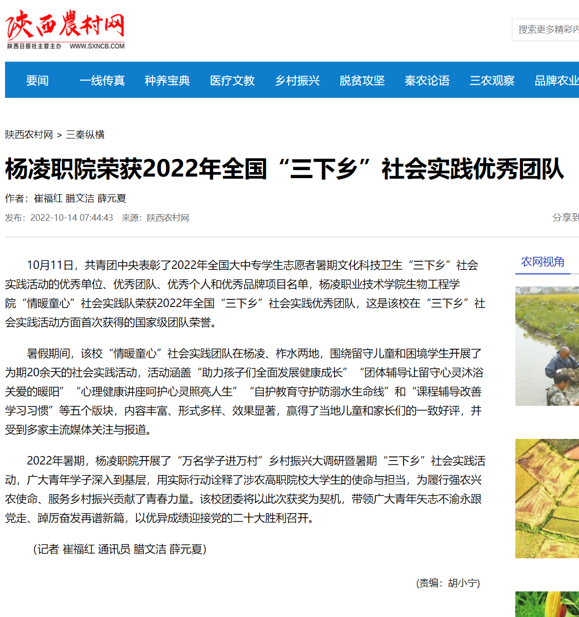 10月11日,共青团中央表彰了2022年全国大中专学生志愿者暑期文化科技卫生“三下乡”社会实践活动的优秀单位、优秀团队、优秀个人和优秀品牌项目名单,杨凌职业技术学院生物工程学院“情暖童心”社会实践队荣获2022年全国“三下乡”社会实践优秀团队,这是该校在“三下乡”社会实践活动方面首次获得的国家级团队荣誉。