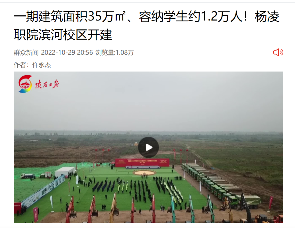 【群众新闻网】一期建筑面积35万㎡、容纳学生约1.2万人!杨凌职院滨河校区开建