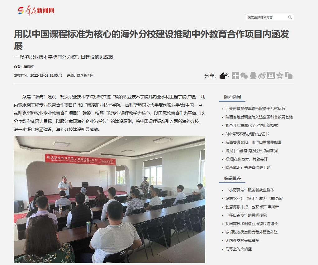 聚焦“双高”建设,杨凌职业技术学院积极推进“杨凌职业技术学院几内亚水利工程学院(中国—几内亚水利工程专业教育合作项目)”和“杨凌职业技术学院—古利斯坦国立大学现代农业学院(中国—乌兹别克斯坦农业专业教育合作项目)”建设,按照“以专业课程教学为核心、以国际教育合作为平台、以分享教学成果为目标、以服务我国海外企业为任务”的建设原则,将中国课程标准引入两所海外分校,进一步深化内涵建设,海外分校建设初显成效。