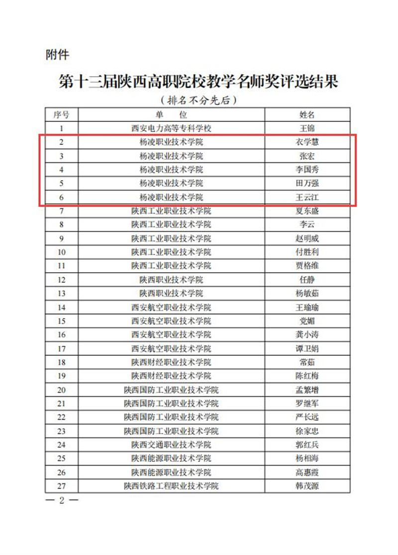 陕西高职院校教学名师奖是陕西高职院校优秀教师的重要奖项,是建设高水平师资队伍、全面落实立德树人根本任务的重要举措。本次全省共有49名教师获评陕西高职院校教学名师奖,杨凌职业技术学院获奖人数为历年来获评此类奖项最多。