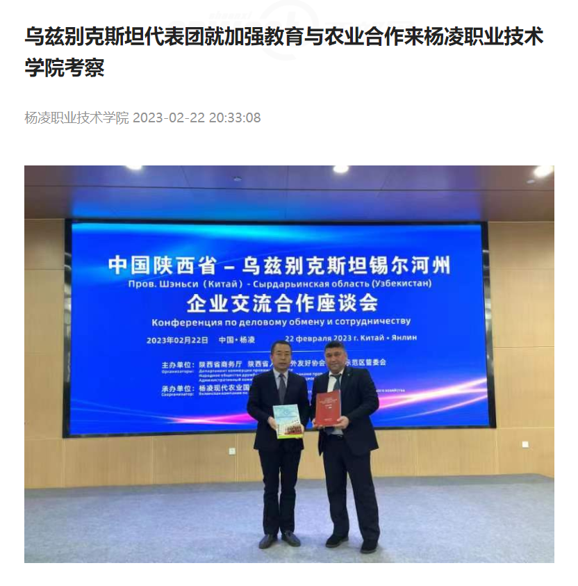 近年来,在上合组织农业技术交流培训示范基地框架内,陕西省与乌兹别克斯坦锡尔河州在农业、教育等领域的合作交流不断加强,杨凌职业技术学院参与建设的“上合组织农业培训示范基地中乌现代农业科技园区”和“杨凌职业技术学院乌兹别克斯坦现代农业技术示范创新基地”,以及与杨凌职业技术学院开展教育合作的古利斯坦国立大学均位于锡尔河州境内。下一步,杨凌职业技术学院将不断加强与锡尔河州有关机构的合作,推进现代农业的科技成果的转化,通过完善在该州的“杨凌职业技术学院乌兹别克斯坦现代农业技术示范创新基地”建设,全面参与“上合组织农业培训示范基地中乌现代农业科技园区”建设,进一步扩大学校在上合组织国家现代农业的引领作用。(文/郭飞 图/史良琦)