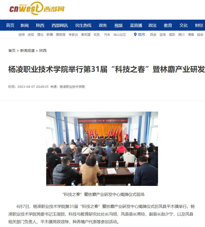 4月7日,杨凌职业技术学院第31届“科技之春”暨林麝产业研发中心揭牌仪式在凤县平木镇举行。杨凌职业技术学院党委书记王周锁、科技与教育研究处处长冯旭,凤县县长蒋铃、副县长赵少宁,以及凤县相关部门负责人、平木镇党政领导、种养殖户代表等参加活动。