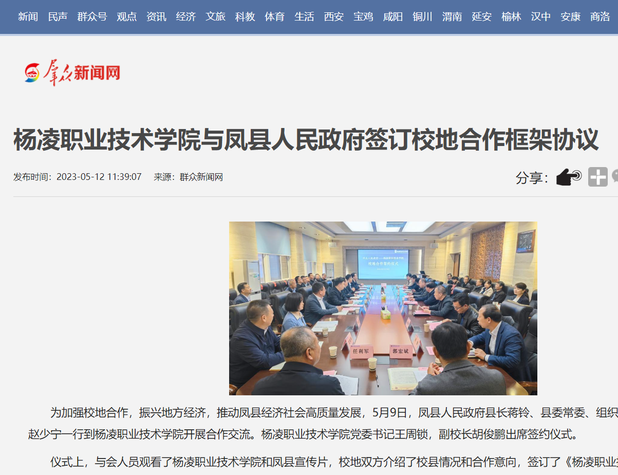 仪式上,与会人员观看了杨凌职业技术学院和凤县宣传片,校地双方介绍了校县情况和合作意向,签订了《杨凌职业技术学院-凤县校地合作框架协议》,就校地合作产学研实训基地建设、乡村振兴人才培训等方面需求开展了座谈交流。