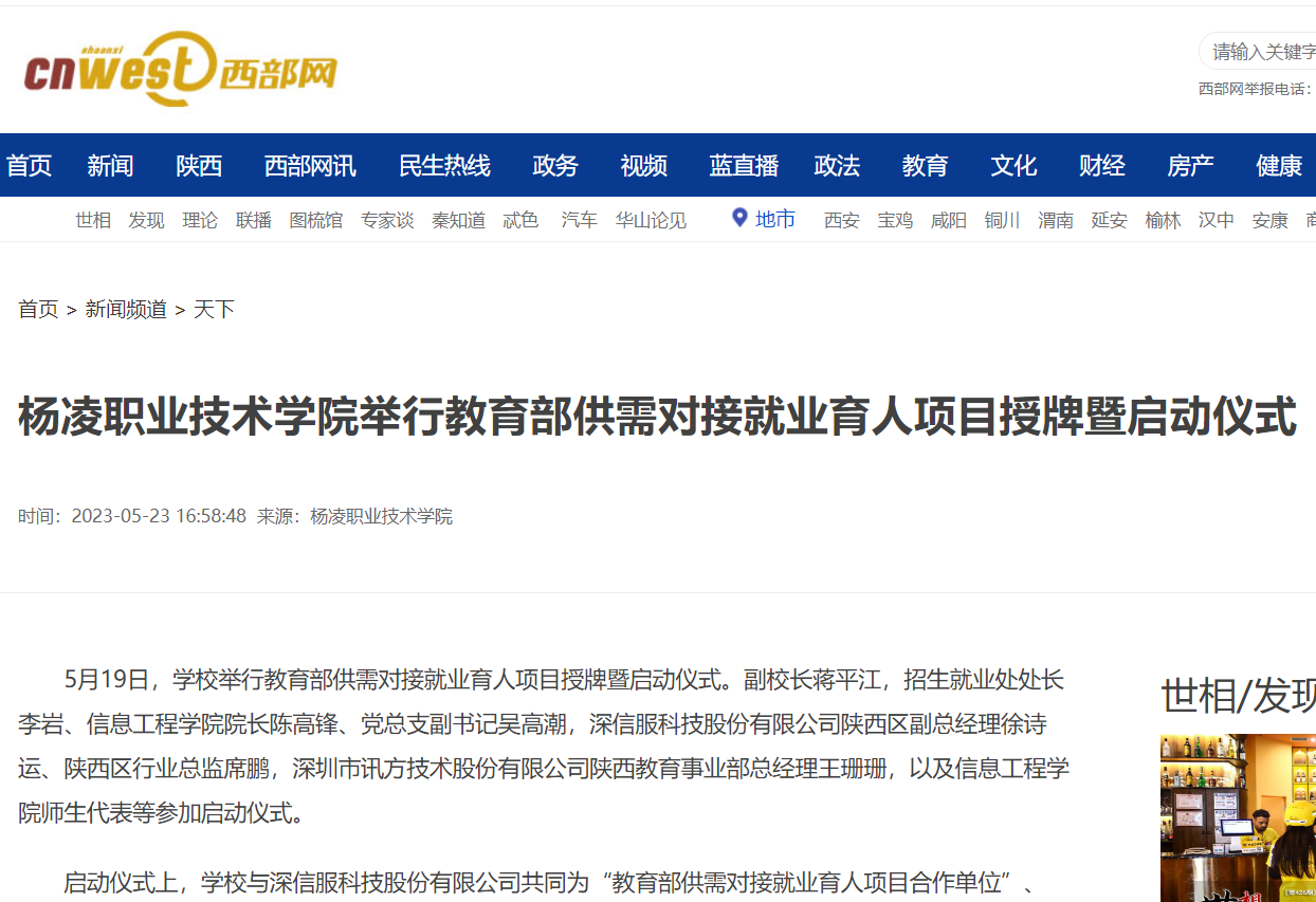 5月19日,学校举行教育部供需对接就业育人项目授牌暨启动仪式。副校长蒋平江,招生就业处处长李岩、信息工程学院院长陈高锋、党总支副书记吴高潮,深信服科技股份有限公司陕西区副总经理徐诗运、陕西区行业总监席鹏,深圳市讯方技术股份有限公司陕西教育事业部总经理王珊珊,以及信息工程学院师生代表等参加启动仪式。