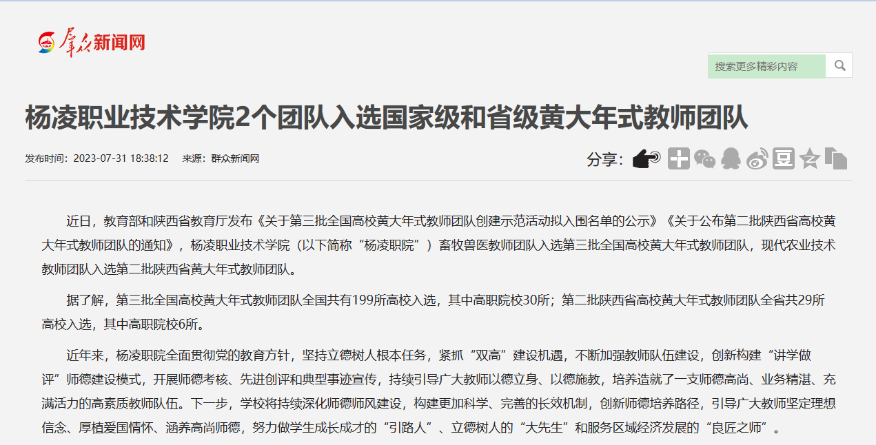 【群众新闻网】杨凌职业技术学院2个团队入选国家级和省级黄大年式教师团队