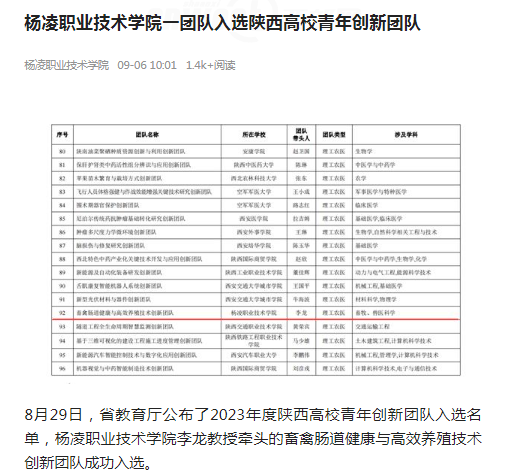 8月29日,省教育厅公布了2023年度陕西高校青年创新团队入选名单,杨凌职业技术学院李龙教授牵头的畜禽肠道健康与高效养殖技术创新团队成功入选。