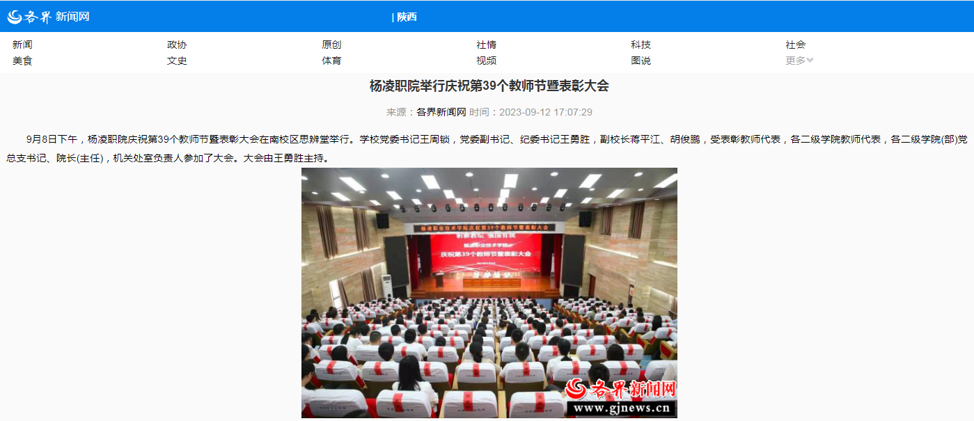 【各界新闻网】杨凌职院举行庆祝第39个教师节暨表彰大会