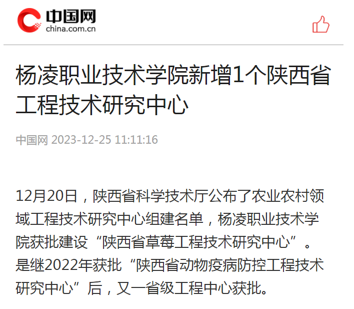 12月20日,陕西省科学技术厅公布了农业农村领域工程技术研究中心组建名单,杨凌职业技术学院获批建设“陕西省草莓工程技术研究中心”。是继2022年获批“陕西省动物疫病防控工程技术研究中心”后,又一省级工程中心获批。