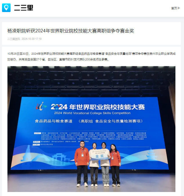 由杨凌职业技术学院生物工程学院张红娟、崔利辉老师指导,杜晶晶、刘蕊华同学组成的代表队以卓越的现场发挥和扎实的专业技能操作勇夺金奖,位列小组第一名。