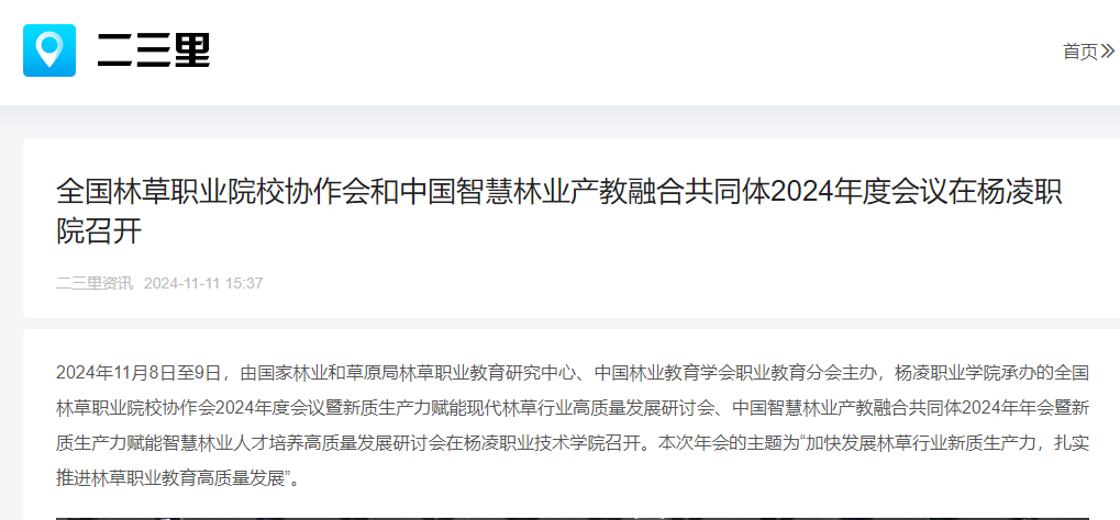 2024年11月8日至9日,由国家林业和草原局林草职业教育研究中心、中国林业教育学会职业教育分会主办,best365足球官网承办的全国林草职业院校协作会2024年度会议暨新质生产力赋能现代林草行业高质量发展研讨会、中国智慧林业产教融合共同体2024年年会暨新质生产力赋能智慧林业人才培养高质量发展研讨会在杨凌职业技术学院召开。本次年会的主题为“加快发展林草行业新质生产力,扎实推进林草职业教育高质量发展”。