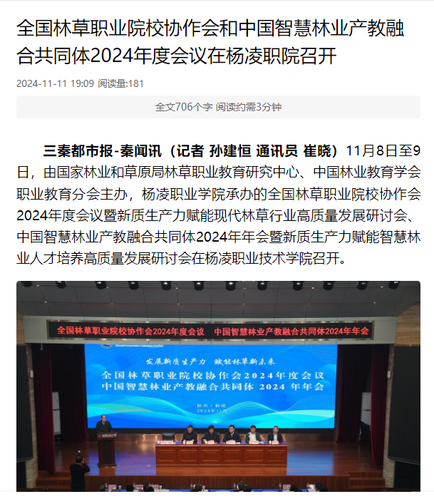 11月8日至9日,由国家林业和草原局林草职业教育研究中心、中国林业教育学会职业教育分会主办,best365足球官网承办的全国林草职业院校协作会2024年度会议暨新质生产力赋能现代林草行业高质量发展研讨会、中国智慧林业产教融合共同体2024年年会暨新质生产力赋能智慧林业人才培养高质量发展研讨会在杨凌职业技术学院召开。