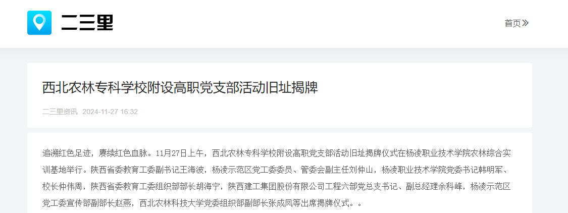 追溯红色足迹,赓续红色血脉。1127日上午,西北农林专科学校附设高职党支部活动旧址揭牌仪式在杨凌职业技术学院农林综合实训基地举行。陕西省委教育工委副书记王海波,杨凌示范区党工委委员、管委会副主任刘仲山,杨凌职业技术学院党委书记韩明军、校长仲伟周,陕西省委教育工委组织部部长胡海宁,陕西建工集团股份有限公司工程六部党总支书记、副总经理余科峰,杨凌示范区党工委宣传部副部长赵燕,西北农林科技大学党委组织部副部长张成凤等出席揭牌仪式。。