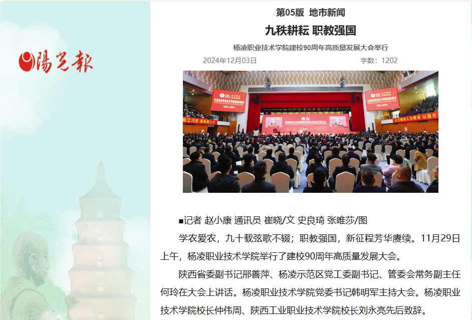 【阳光报】九秩耕耘 职教强国 杨凌职业技术学院建校90周年高质量发展大会举行