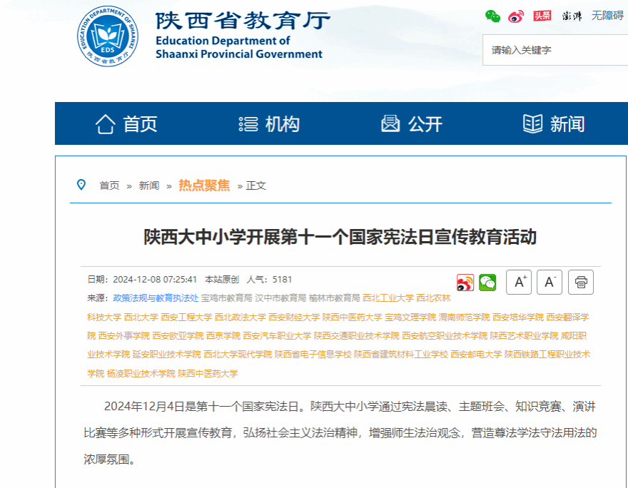 2024年12月4日是第十一个国家宪法日。陕西大中小学通过宪法晨读、主题班会、知识竞赛、演讲比赛等多种形式开展宣传教育,弘扬社会主义法治精神,增强师生法治观念,营造尊法学法守法用法的浓厚氛围。
