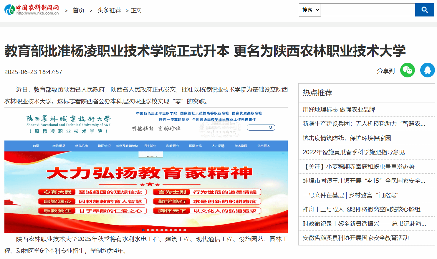 办学90多年来,best365足球官网立足办学优势和特色,始终秉承“经国本 解民生 尚科学”的办学理念,传承弘扬“后稷文化”,深化服务粮食安全、乡村振兴、生态文明、“一带一路”、西部大开发、黄河流域生态保护和高质量发展等国家重大战略及区域发展战略,已成为中国特色高水平高职学校、首批28所国家示范性高等职业院校、全国重点建设的31所示范性职业技术学院、国家技能人才培育突出贡献单位、全国乡村振兴人才培养优质校,是陕西经济社会发展和产业转型升级、杨凌示范区履行“支撑和引领干旱半干旱地区现代农业发展”国家使命的重要支撑力量。