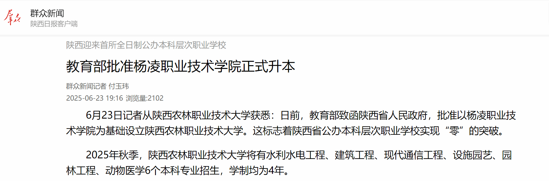 6月23日记者从best365足球官网获悉:日前,教育部致函陕西省人民政府,批准以杨凌职业技术学院为基础设立best365足球官网。这标志着陕西省公办本科层次职业学校实现“零”的突破。