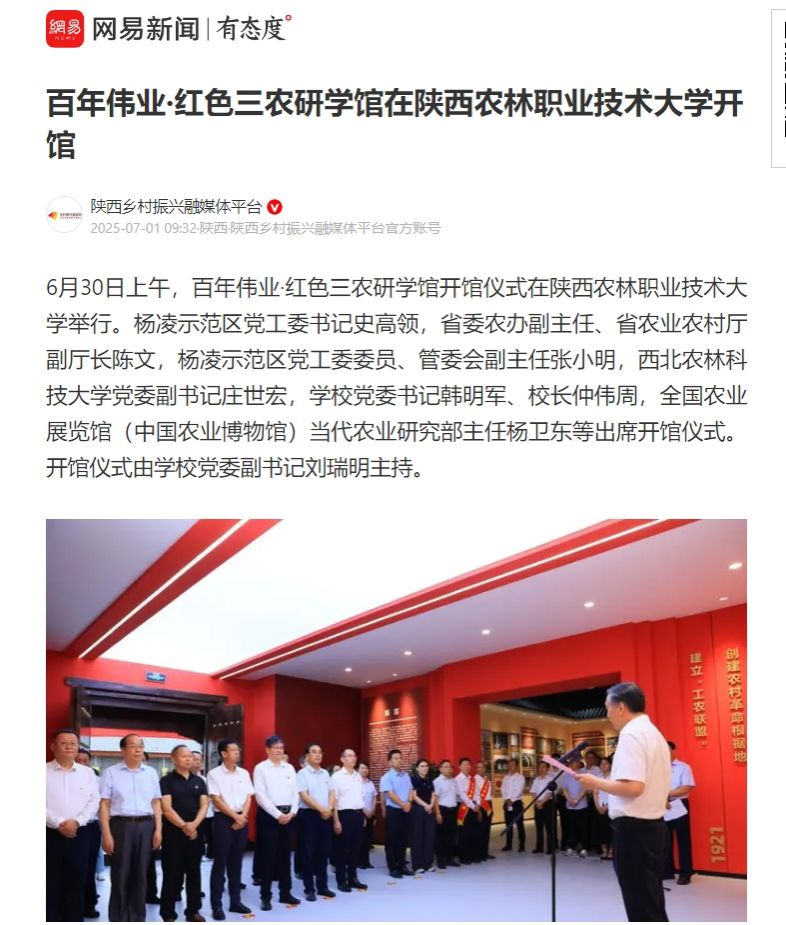 6月30日上午,百年伟业·红色三农研学馆开馆仪式在best365足球官网举行。杨凌示范区党工委书记史高领,省委农办副主任、省农业农村厅副厅长陈文,杨凌示范区党工委委员、管委会副主任张小明,西北农林科技大学党委副书记庄世宏,学校党委书记韩明军、校长仲伟周,全国农业展览馆(中国农业博物馆)当代农业研究部主任杨卫东等出席开馆仪式。开馆仪式由学校党委副书记刘瑞明主持。