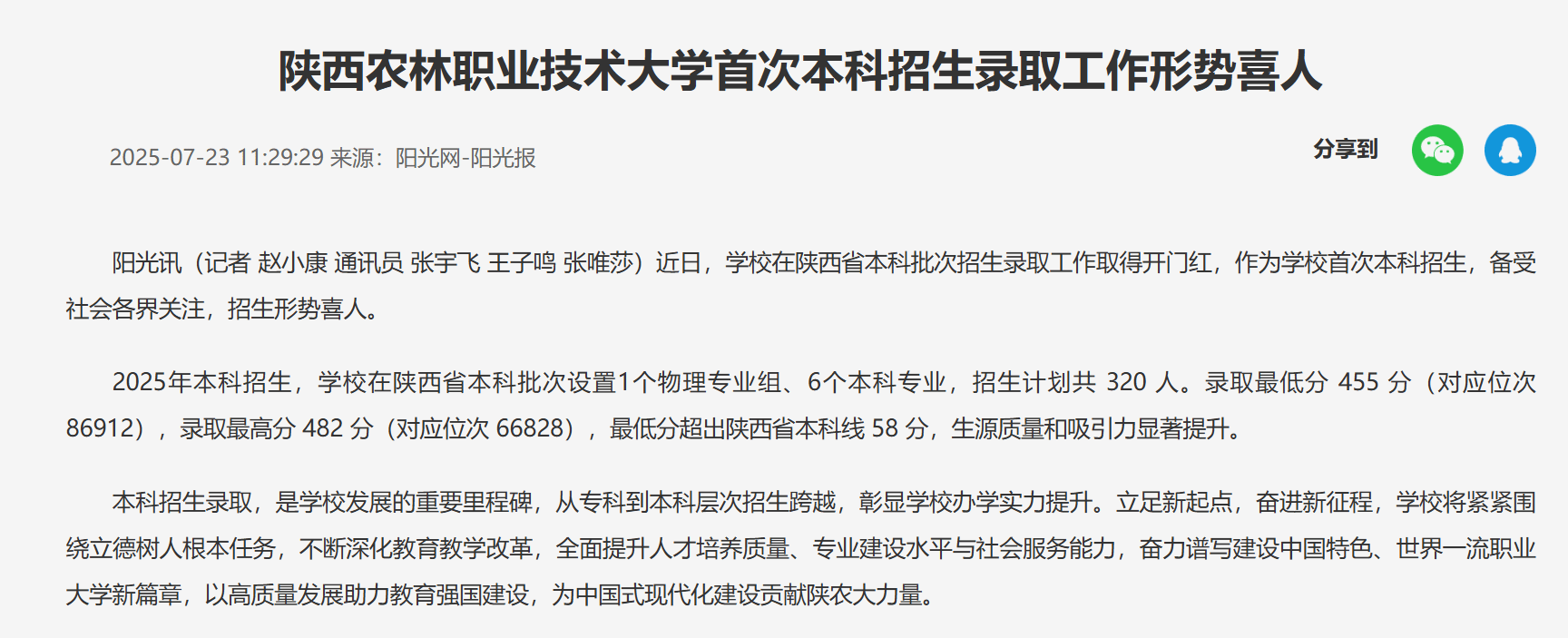 本科招生录取,是学校发展的重要里程碑,从专科到本科层次招生跨越,彰显学校办学实力提升。立足新起点,奋进新征程,学校将紧紧围绕立德树人根本任务,不断深化教育教学改革,全面提升人才培养质量、专业建设水平与社会服务能力,奋力谱写建设中国特色、世界一流职业大学新篇章,以高质量发展助力教育强国建设,为中国式现代化建设贡献陕农大力量。