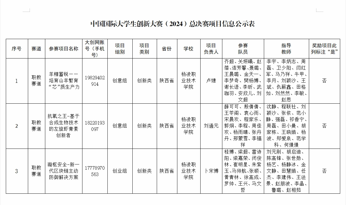 杨凌职业技术学院推荐中国国际大学生创新大赛(2024)总决赛项目信息公示